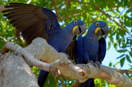 琉璃金刚鹦鹉,成对的生活在森林、开阔的原野,沼泽或接近水源的地方,喜欢在棕榈树洞筑巢。“夫妇”相惜的生存让人类自愧不如。