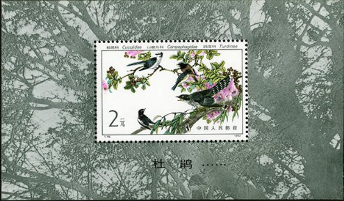 1982年9月10日发行的《益鸟》特种邮票,其中小型张“大杜鹃”,图案原画作者为我国已故著名花鸟画画家田世光先生。他采用传统中国画中的工笔重彩双钩技法描绘了在鲜花盛开的树枝间栖息的几只杜鹃。