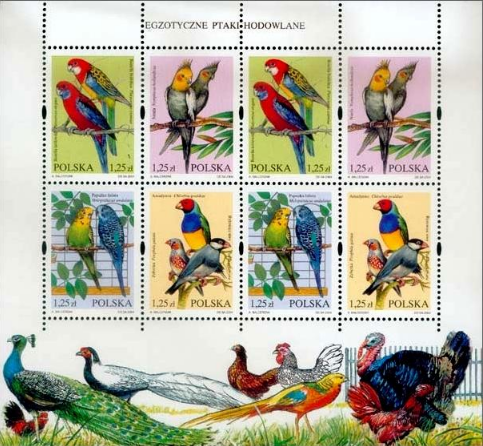 2004年6月30日,波兰邮政发行一套4枚《奇异的鸟类》邮票,表现了来自海外的深红玫瑰鹦鹉(原产澳大利亚)、高冠鹦鹉(原产澳大利亚)、虎皮鹦鹉(原产澳大利亚)和斑马芬雀(原产澳大利亚)。