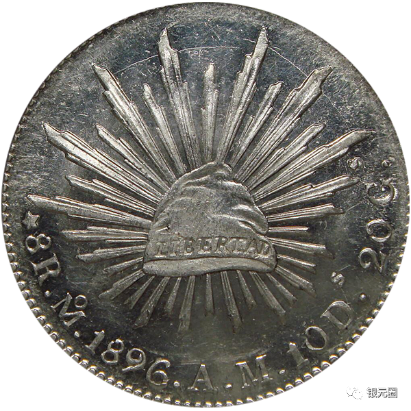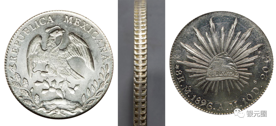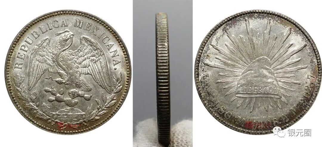 直边鹰洋背面自由帽较大,光芒线较短,货币单位为“UNPESO”(一比索,墨西哥新型货币单位)。