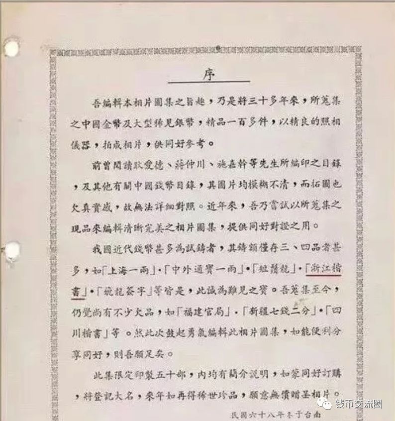 浙江地处沿海,通行洋银甚早,清季虽已设厂造币惟大量产制银元是民国以后的事。由于筹建较迟,光绪二十五年浙局开铸后即奉旨停工,机器拆迁他处;营运期间所出银币数额不多,因正面采用魏晋南北朝时期碑文的书法,俗称“魏碑”。然而存世另有一种铭文为楷体之“浙江楷书”,极罕见。惜国内文献记载欠缺,故早年藏界对其出处及年代的说法纷纭,莫衷一是。