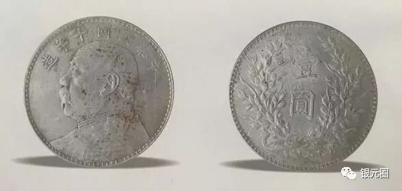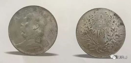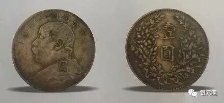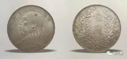 版别特征:该银元图案与十年九年版基本相同,其主要特征是袁像肩章同九年肩章,背嘉禾右侧长叶为空心叶,“圆”字下方有轻微复打,故称“十年九年版空心叶版”。