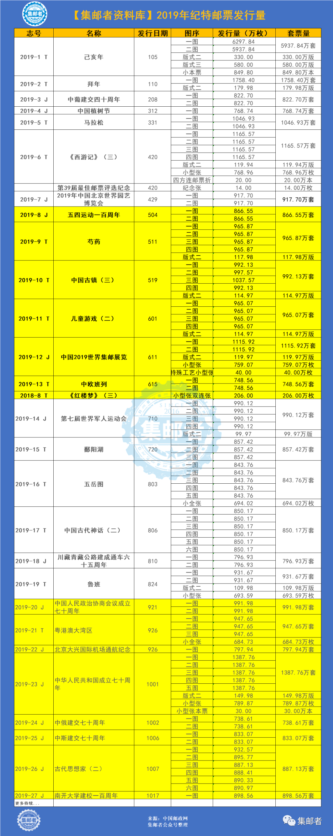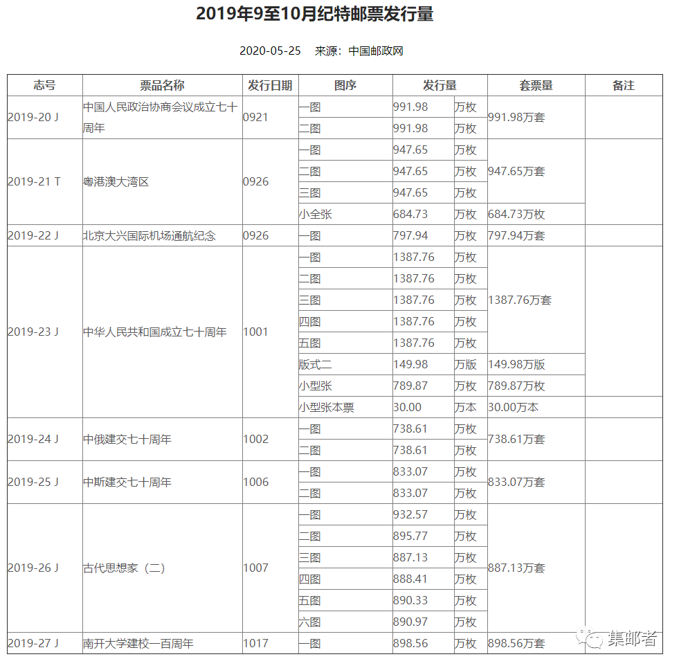 看看2019年已公布的1-10月的新邮发行量吧,估计11月12日发行量将于今年7月底左右公布,届时2019年全年邮票发行量就透明化了: