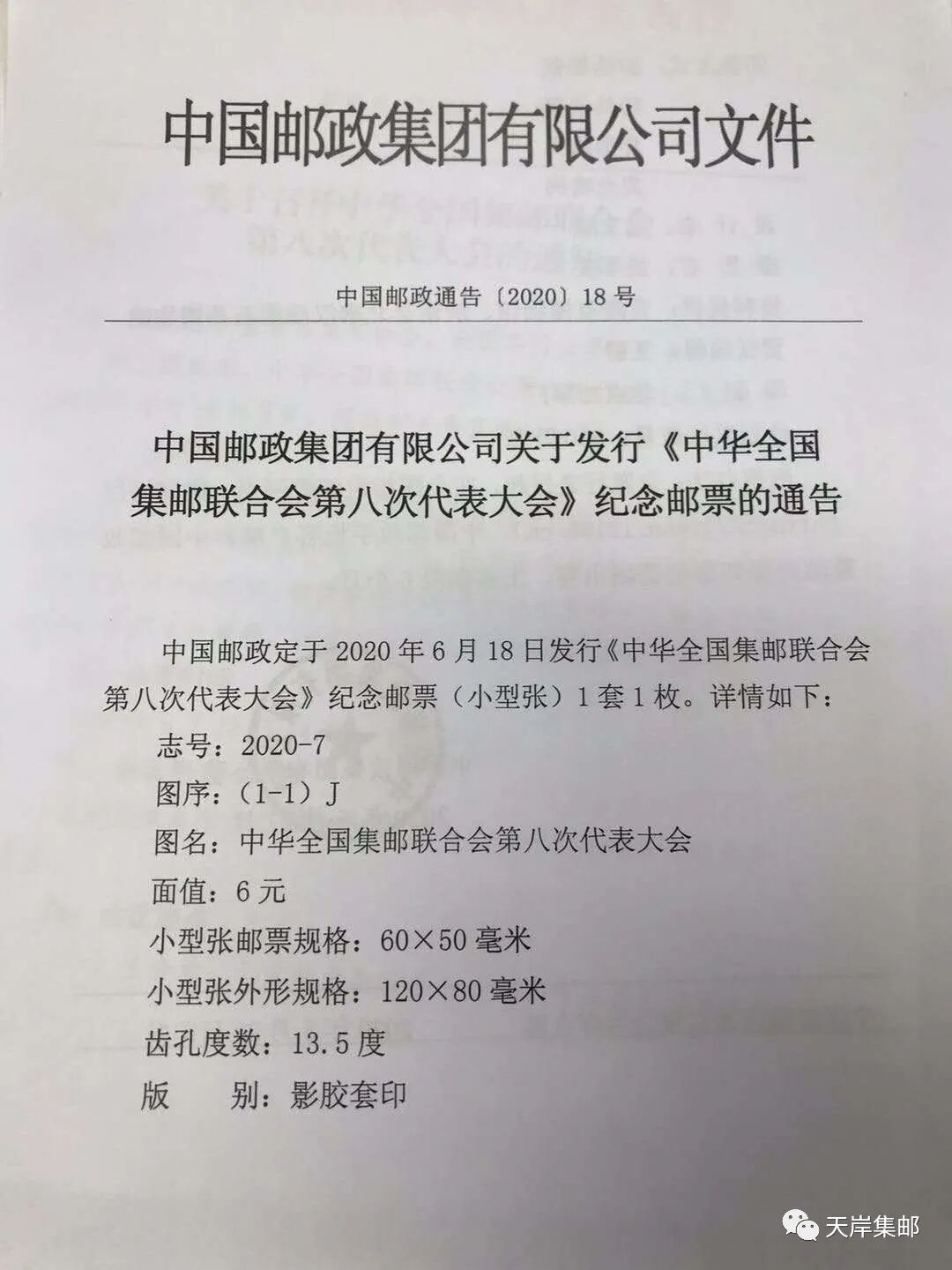 中国邮政定于2020年6月18日发行《中华全国集邮联合会第八次代表大会》纪念邮票(小型张)1套1枚.详情如下: