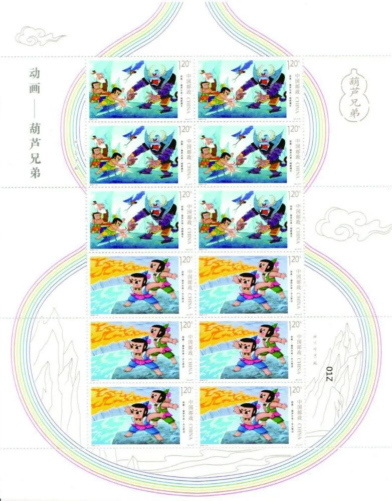 邮票图案名称分别为:七色葫芦、梦窟迷境、绝路逢生、水火奇功、巧夺如意、七子连心。“七色葫芦”:主要讲述的是善良的老爷爷种下葫芦籽后,很快结出了七个色彩不同的葫芦。老爷爷高兴得左手抱一个,右手抱一个,并亲切地和小葫芦们交谈。“梦窟迷境”:主要讲述的是拥有千里眼和顺风耳神力的二娃前去妖洞救大哥和爷爷,蛇精使用毒计诱骗二娃进入迷境宫,二娃最终落入蛇精圈套。“绝路逢生”:主要讲述的是三娃大战群妖,打得妖怪落花流水,抱头鼠窜,画面表现的是三娃用神力斩断蝎子精的宝刀,蝎子精大惊失色的情形。“水火奇功”:主要讲述的是水娃和火娃为了扑灭山火拯救生灵,一个喷水熄火,一个张嘴将大火吸入腹中,无意中也救了放火的蛇、蝎二妖。“巧夺如意”:主要讲述的是拥有隐身神力的六娃机智勇敢地盗取了蛇妖的宝贝“如意”,救出了几位兄长。“七子连心”:主要讲述的是七个葫芦娃全部被妖精关进炼丹炉,准备炼成“七星丹”,在此生死时刻,老爷爷不顾个人安危,冒死取出山神给予的“七色莲花”,使七个葫芦娃连成一心,最终将妖精全部消灭。《葫芦兄弟》是上海美术电影制片厂于1986年原创出品的13集系列剪纸动画片,是中国动画第二个繁荣时期的代表作品之一,至今已经成为中国动画经典,该动画自播出以来,一直受到广大观众,尤其是少年儿童们的喜爱。邮票版式一采用了七色线条构成的葫芦形状作为画面边饰,元素表现极具特色,更与邮票主题相映成趣。该套邮票由宋鉴设计,北京邮票厂采用影写版印制。在紫外灯照射下,每枚邮票呈现出令人惊艳的画面效果。邮票两侧葫芦形状异形齿孔,更增添了把玩趣味。