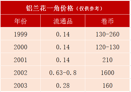 2002年,这个年份正是经济紧缩的年份,当时金融危机后正赶上通缩年,所以该年铝兰花一角的发行量不言而喻。