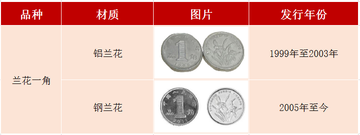 1999、2000、2001、2002、2003这五个年份发行的兰花一角硬币,铸造上都采用了菊花一角的材质(铝镁合金),在收藏界被称为铝兰花五朵金花。