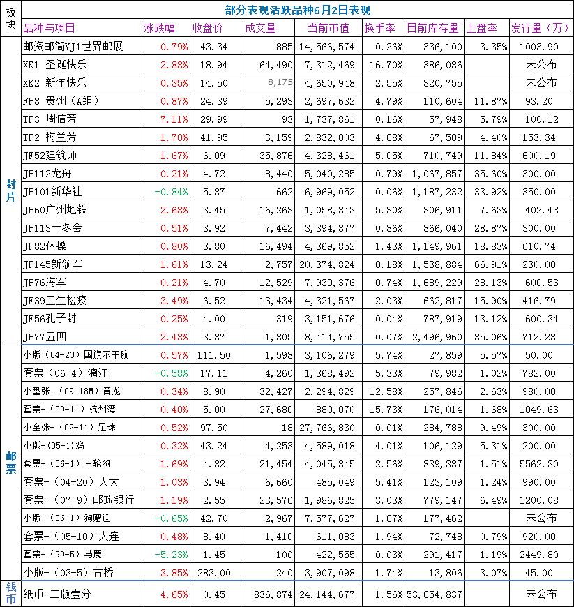 邮票板块:指数小幅收跌,大部分品种表现较弱,个别品种有较好表现,如杭州湾、拜年套票等。今天挂牌的新邮票,绝大部分收涨,其中套票(军2)义务兵专用、八十七神仙卷、贺禧五不干胶等成交活跃,表现较好。