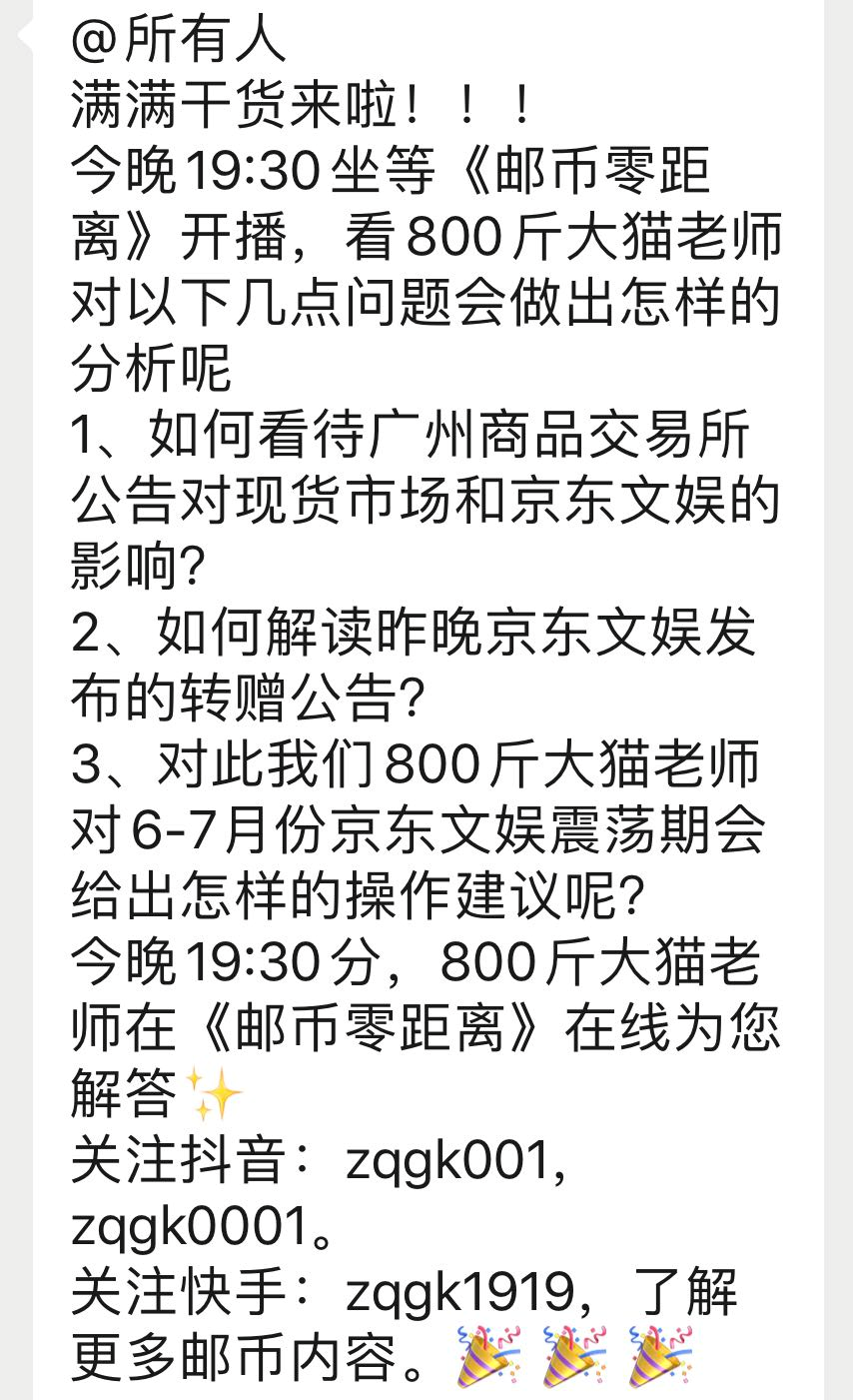 今晚,邮币零距离直播中将邀请800斤大猫老师与大家交流有关他对商品转增细则的解读以及对于京东文娱寄卖6-7月份的操作建议,值得期待晚间的精彩。