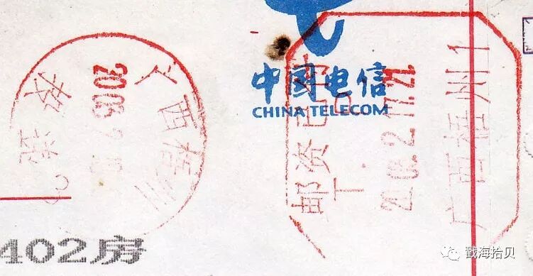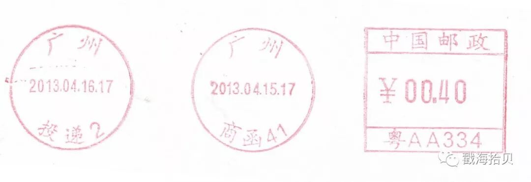 无独有偶,2013年的广州邮政局也使用这种将“投递”日戳和收寄日戳连在一起使用的过戳方式,所不同的是,收寄日戳由“邮资已付”日戳换成了邮资机戳。