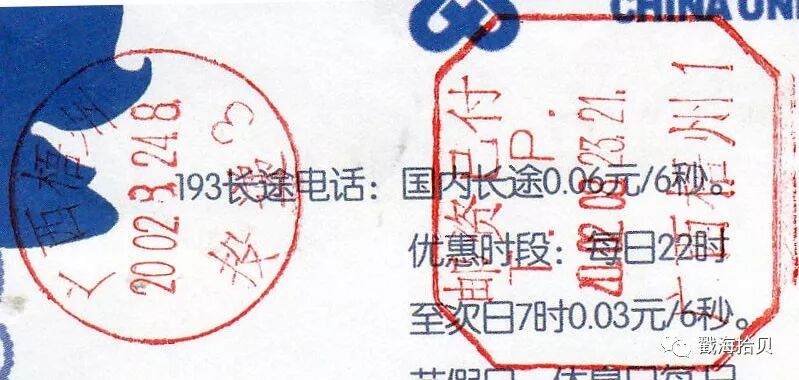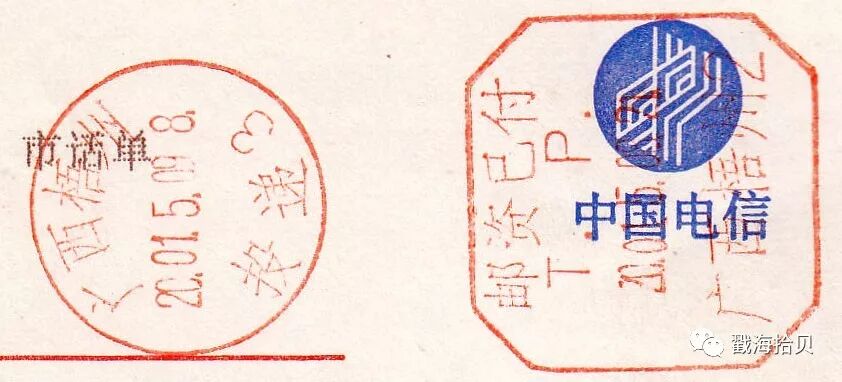 广西梧州市邮政局在2000年前后,将市内账单类函件盖销邮资已付日戳和盖销落地戳这2道程序变为1道,把“邮资已付”八角戳和“投递”日戳同时固定在过戳机的转轴上,一同加盖出来(投递日戳的时间为邮资已付日戳的次日)。
