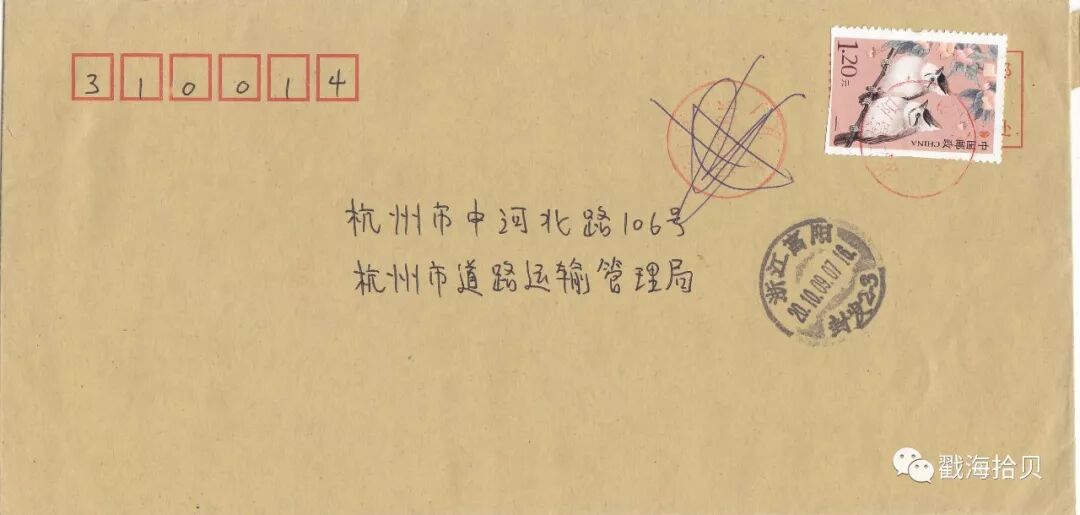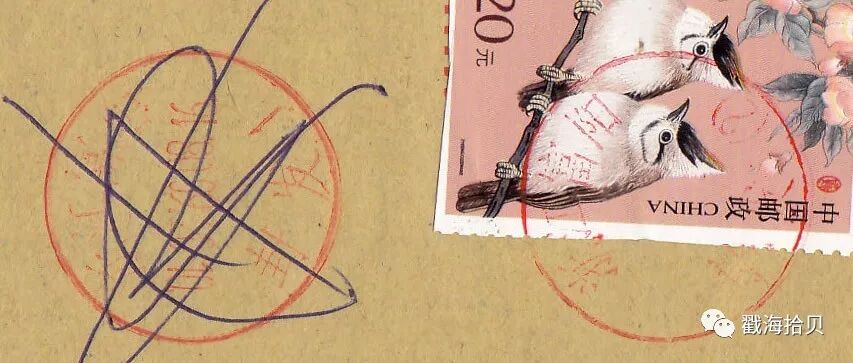 但富阳这款戳更像是调试机器使用,因为我收集到的同一天寄出的5件实寄封的机盖日戳日期都是乱码,被涂抹掉而另外加盖手戳。
