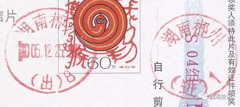 湖南郴州使用的这一款“(出)8”&“(进)1”连体机盖戳很多邮友都见过,这戳使用了小半年时间,用于出口平信销票,当年我有一郴州邮友,知我收集邮戳,隔三差五便寄我此戳,因此我收集了不少,这戳将未装填字钉的“(进)1”戳连接在“(出)8”戳上一起使用,具体为何原因,我曾经托那位邮友到邮局了解,但未果。我推断是郴州邮局原有销票用的“(出)8”戳水波纹部分损坏,连接上另一日戳增加销票面积。
