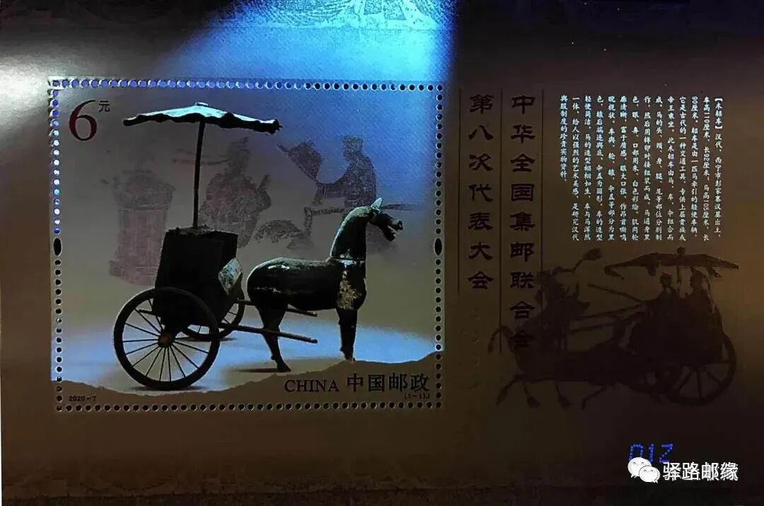 2、边饰选取了沂南汉墓画像砖《迎宾图》中的局部,包含早期的桓表形象以及官员乘坐木轺车出行的场景,底色采用暖色系的色调加以衬托,突出展现了文物的历史悠远,也体现出中华全国集邮联合会第八次代表大会的庄重性。