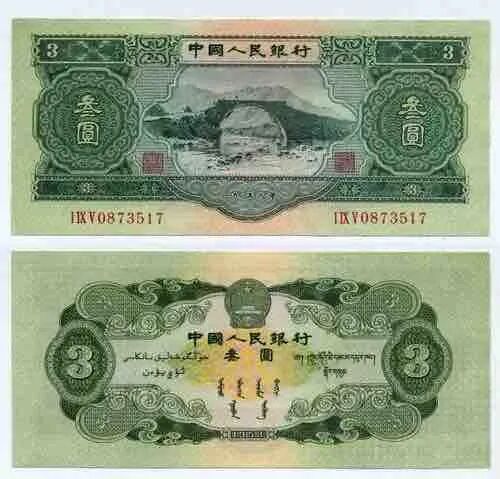 分古币水印和空心五角星水印两个版别,这是三版币中较珍稀的品种,票面正面图案为拖拉机手,象征农业为基础,背面的羊群象征发展畜牧业。