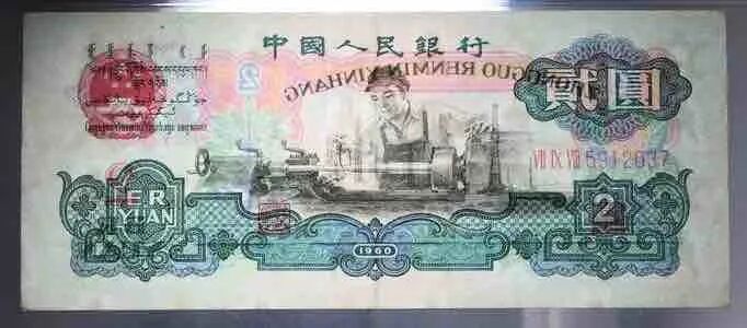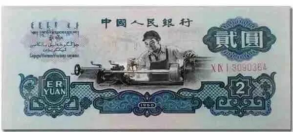 1960版贰圆古币水印券票券正面图案是车床工人生产作业,象征工业为主导。