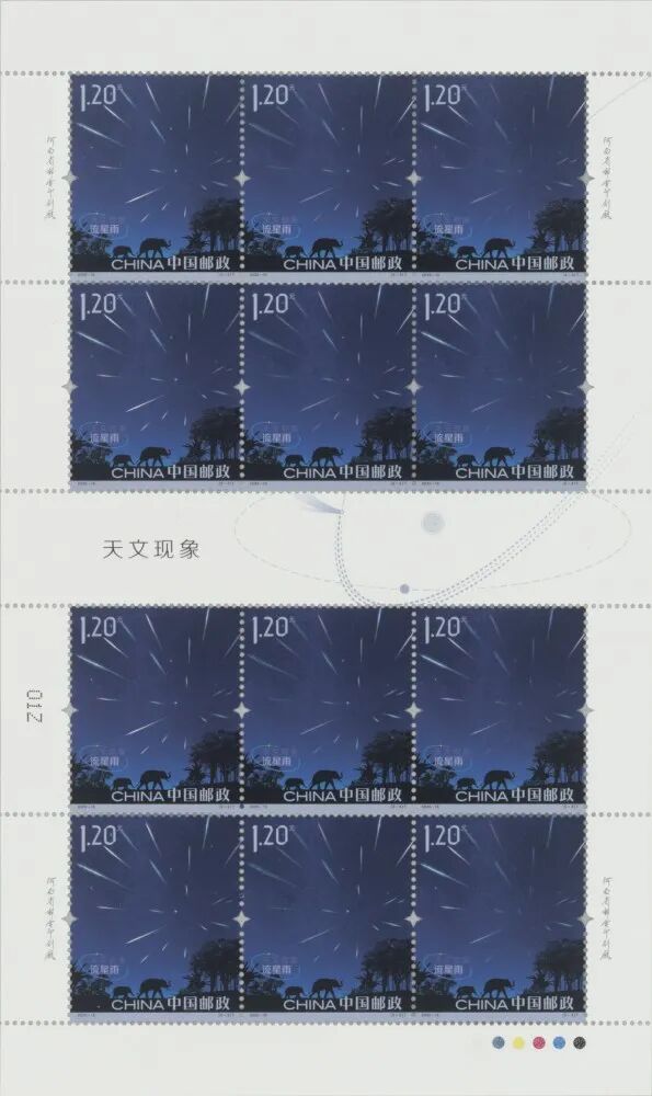 星际空间的微细尘埃以高速闯进大气层,与大气分子磨擦生热而产生白炽光形成流星,流星划过天空会出现的一条短暂的亮带。邮票第三枚“流星雨”以对冲的角度再现绚丽的流星雨场面。