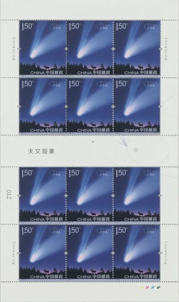 彗星和行星一样,是围绕着太阳公转的天体。彗星之所以长着尾巴,是其表面有高度活性的物质被释放出来。彗星的彗核是水、冰和尘埃等活性物质和岩石结合而成,活性物质在太阳热量的作用下挥发,形成非常稀薄的大气,即彗发。邮票第四枚“大彗星”,中国古代又称“扫把星”,意为大彗星降落形态似扫把。图中的彗星有彗核、彗发和彗尾。