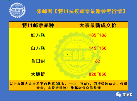 今天特11行情较昨天继续上涨,大宗市场中大版折最高成交价在850元,目前在820-830左右,红方联行情稳定,首日封的行情交易量较小,成交价下跌至62元。