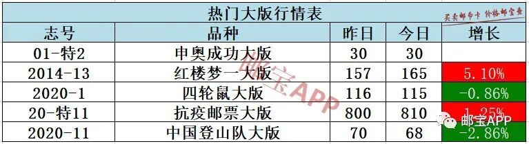 抗疫邮票大版昨日行情为800元,今日价格为810元,上涨1.25%。
