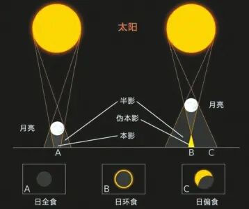 日环食和日偏食观测位置示意图。
