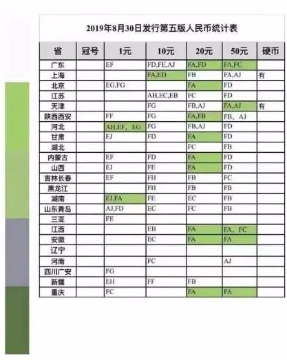 截止到2019年12月31日,19版1元券共投放19个冠号,10元券共投放13个冠号,20元券共投放7个冠号,19版50元券共投放9个冠号,各面值共计投放48个冠号。可见19版纸币无论市面上还是银行里都少见,这就是原因,投放量太少。