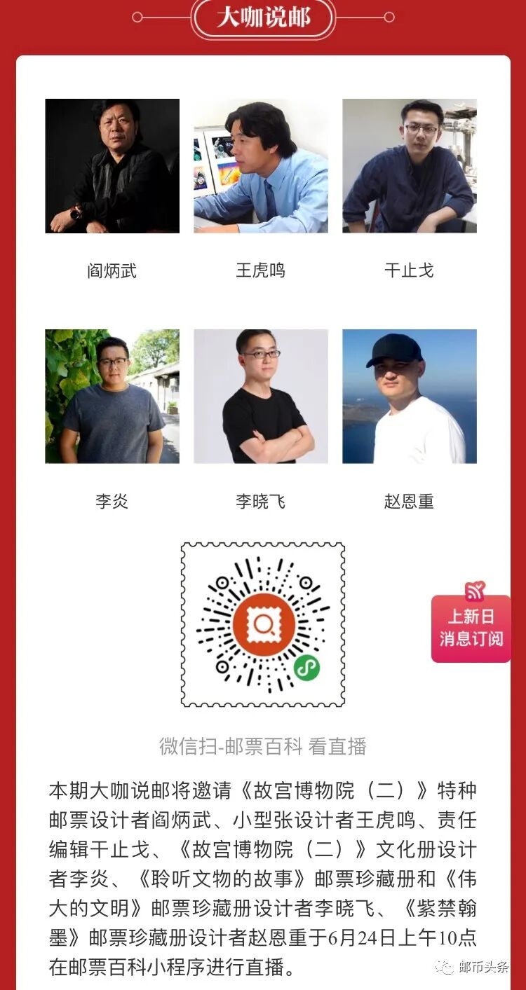 《故宫博物院(二)》设计者阎炳武+王虎鸣,明天图稿将亮相! 日期:2020-06-23 来源:邮币头条 大家晚上好,我们都知道,为庆祝2020年是故宫建成600周年,7月11日将安排发行《故宫博物院(二)》特种邮票一套4枚、小型张1枚,表现故宫建筑和历史文化藏品。从目前我们已知的消息来看,该套新邮的设计者为阎炳武、小型张设计者为王虎鸣、责任编辑干止戈,具体的设计图稿我们将在明天的直播中可以看到,大家可以期待一下啦……前几天我们看到了相关邮品,确定《故宫博物院(二)》还将安排发行版式二……关于该套新邮的设计者阎炳武老师,我们可以详细了解一下……