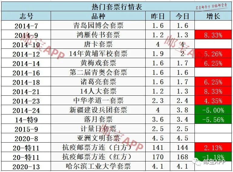 鸿雁传书套票昨日行情为1.2元,今日价格为1.3元,上涨8.33%。