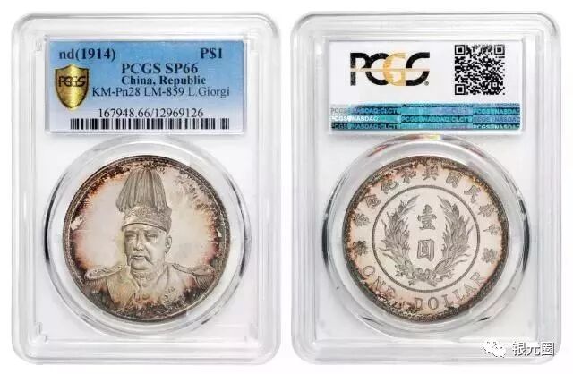 ▲袁世凯像共和纪念“L.GIORGI”签字版壹圆银样币 PCGS SP66