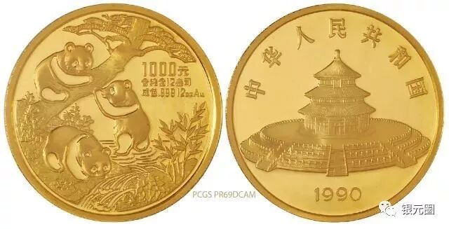1990年熊猫金币,精制,面值1000元,成色99.9%,发行量500枚,背面图案为天坛及年号,正面为三熊猫图。