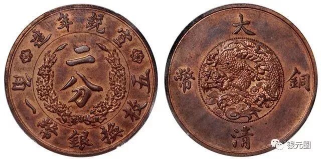宣统年造大清铜币二分试铸样币,未发行流通,存世稀少,铸造精美,仍带原厂铜光,品相极佳。