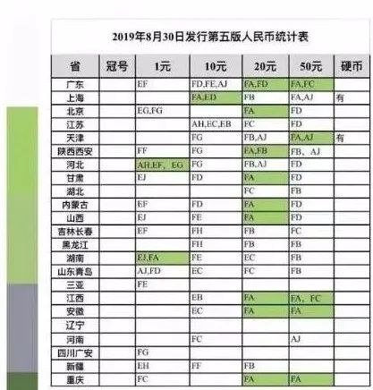 纸币的首发冠号为FA,共发行有19版,有1元、10元、20元、50元四个版别。