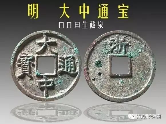 元楷书“大中通宝”钱。元末朱元璋为吴王时所铸,钱文端庄。元末社会动乱,纸币支持的经济体系严重破坏,元境内各地先后恢复了铜钱的流通。六支反元军事集团先后发行了自己的铜币,如韩林儿的“龙凤通宝”钱,张士诚的“天佑通宝”钱,明玉珍的“天统通宝”钱,以及朱元璋“大中通宝”钱。