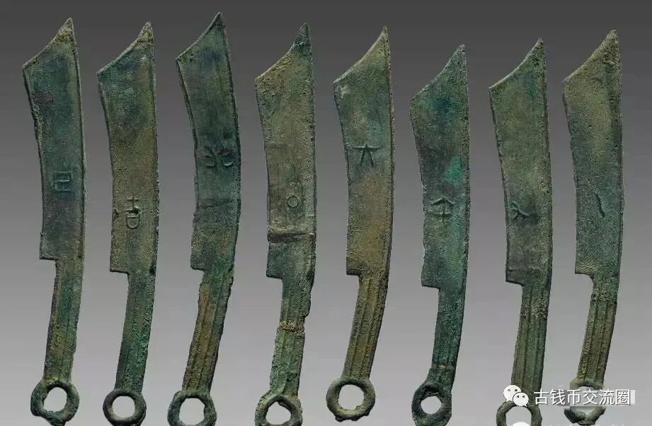 最为典型的刀币有齐国的“齐法化”、“齐返邦长法化”,燕国的“尖首刀”、“明宇刀”,赵国的“甘丹”、“王化”字的圆首刀币等,“齐返邦长法化”6字刀币,长18.5厘米,重45克左右,这种文体具有生命活力的美感。
