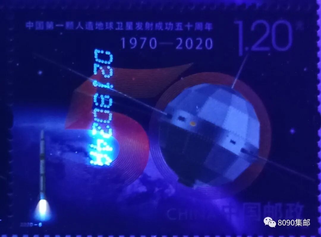 印刷上北京厂使用了特殊邮票和压凸工艺,突出了东方红卫星立体感。在荧光灯下,其采用三种无色油墨印刷的火箭喷射和红色线条构成的“50”字样,在荧光灯下熠熠生辉。
