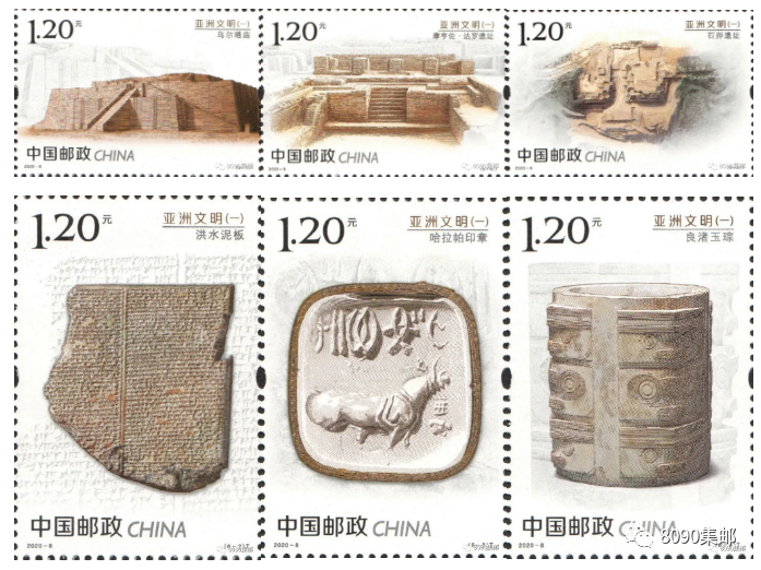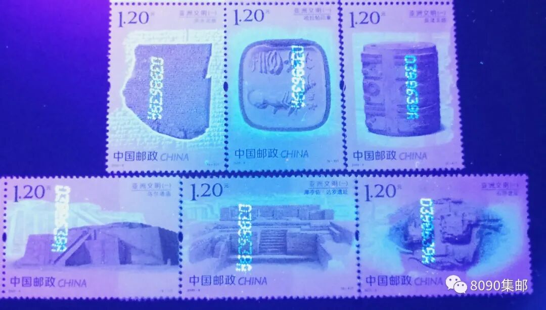 在荧光灯下,邮票背景的泛着浅蓝色的光芒,即寓意水孕育文明之感。虚实结合之间,突出邮票上每一件文物和遗址。