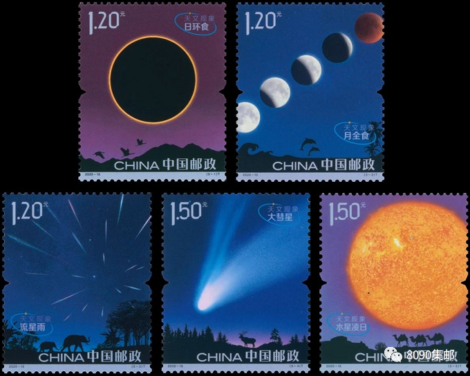 中国邮政于6月21日发行《天文现象》邮票一套五枚,邮票由原艺珊设计,河南省邮电印刷厂采用胶版印制。