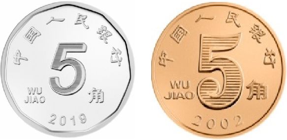 变化最大是5角硬币,5角硬币材质由钢芯镀铜合金改为钢芯镀镍
