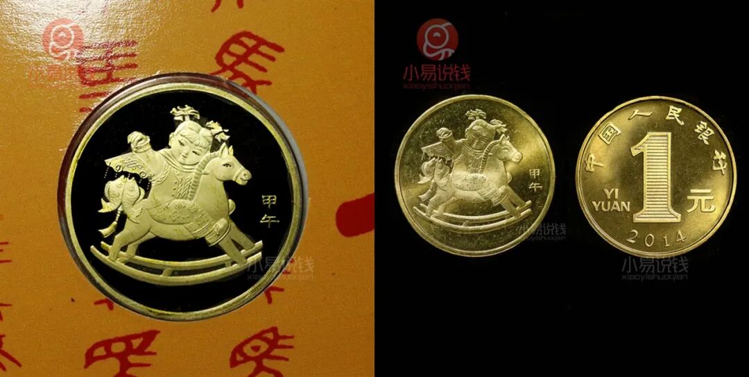 来看对比,同样是2014年的马年生肖币,左侧是精制币,右侧是普制币,差别非常明显: