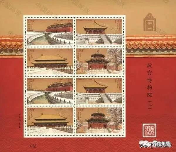 “故宫”邮票的第一组设计了附票,但没设计小型张,第二组邮票少了附票,却增加了1枚型张。这是两组票最大的不同。