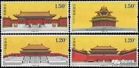 “故宫”邮票,都在于展现紫禁城古建的雄伟壮观,但两组票,对于古建的描绘上,技法有所变化。一组4枚票突出了4座古建筑高大宏伟的形象,但古建下部的托景很少,略显单调。