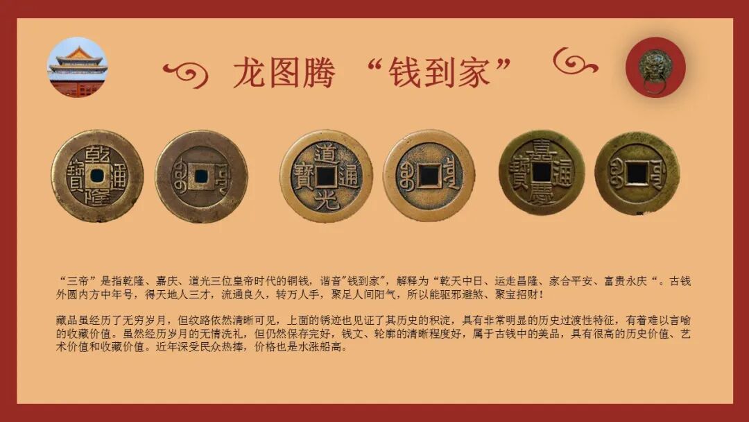 另外,珍藏册还配备了“三帝钱”,“三帝钱”是指乾隆、嘉庆、道光三位皇帝时代的铜钱,谐音"钱到家",解释为“乾天中日、运走昌隆、家合平安、富贵永庆“。古钱外圆内方中年号,得天地人三才,流通良久,转万人手,聚足人间阳气,所以能驱邪避煞、聚宝招财!