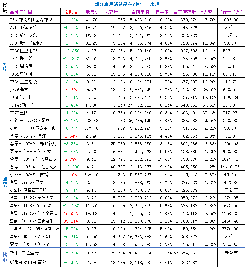 邮票板块:微跌,弱势横盘。涨幅较大的领涨品种出现较大幅度回调,充分消化获利盘,多数活跃品种跟跌,非热门品种小部分品种仍有积极表现,如套票总工会、古代文学家(四))等。领涨品种回调,投资者信心受挫,买盘较为谨慎。充分回调换手后有望重拾升势。