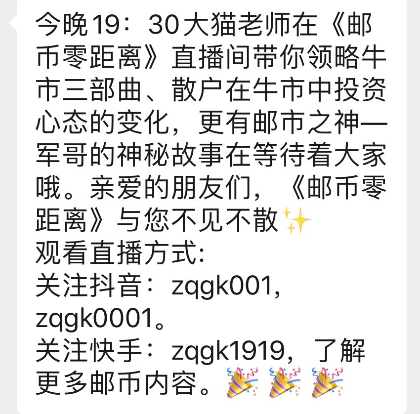 今晚邮币零距离直播将邀请到800斤大猫老师分享其在牛市中投资的经验、介绍邮市之神的神秘故事,精彩值得期待。
