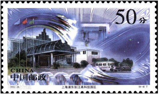 (6-4)为“张江高科技园区”。画面以高科技园区管理中心大楼为主图,背景以光纤电缆、电子技术和生物工程等内容衬托,展示了园区的发展前景。