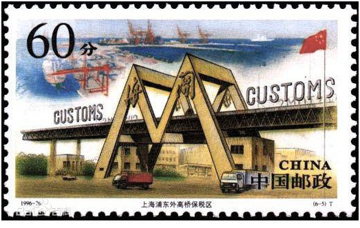 (6-5)为“外高桥保税区”。画面以外高桥海关大门为主图,背景衬以外高桥港区。