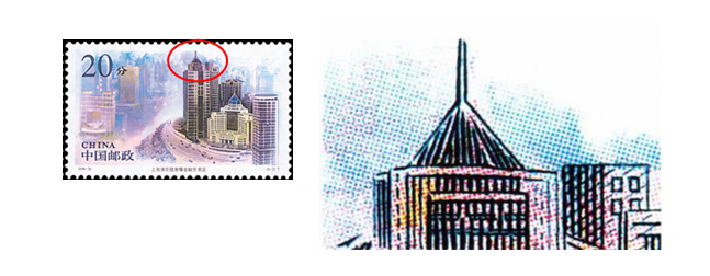 (6-2)为“陆家嘴金融贸易区”。画面以中国人民银行上海分行所在的银都商厦和证券大楼为主图,背景则为中国银行、交通银行、工商银行、农业银行、浦东发展银行、招商银行、上海投资信托银行、上海证券交易所等在这里投资建筑的金融楼群。