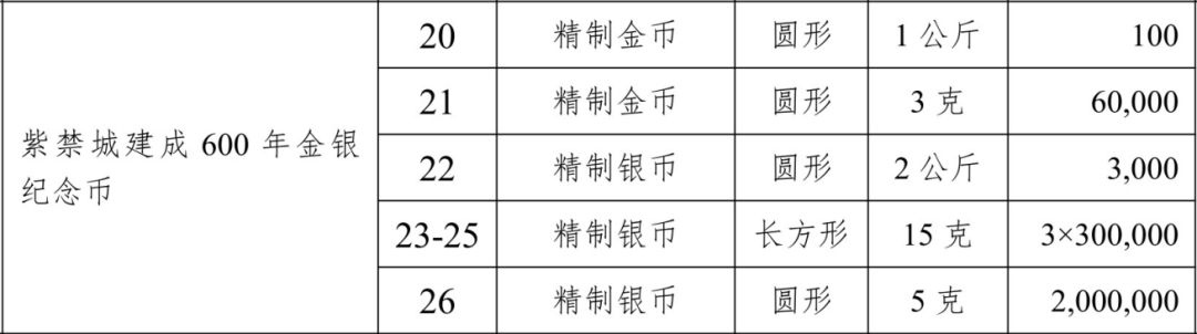故宫纪念币一共5个规格,7枚币。其中3克金币、15克银币、5克小银币,都是很热门的品种。