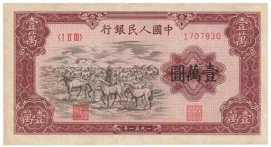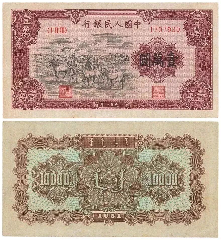 而第一套人民币中一万元面值的“牧马图”,发行于1951年5月17日,在1955年4月1日被收回,流通时间,总共都不到四年。