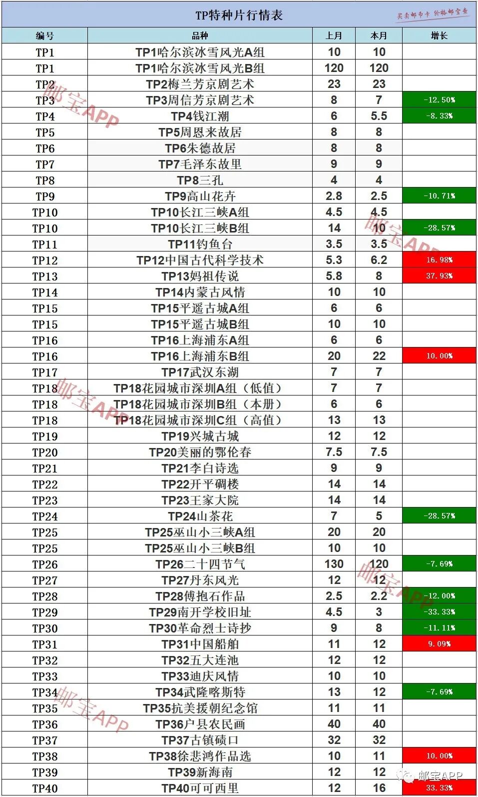 其他TP特种片变化不大,具体明细请查看下表或前往邮宝APP查询。
